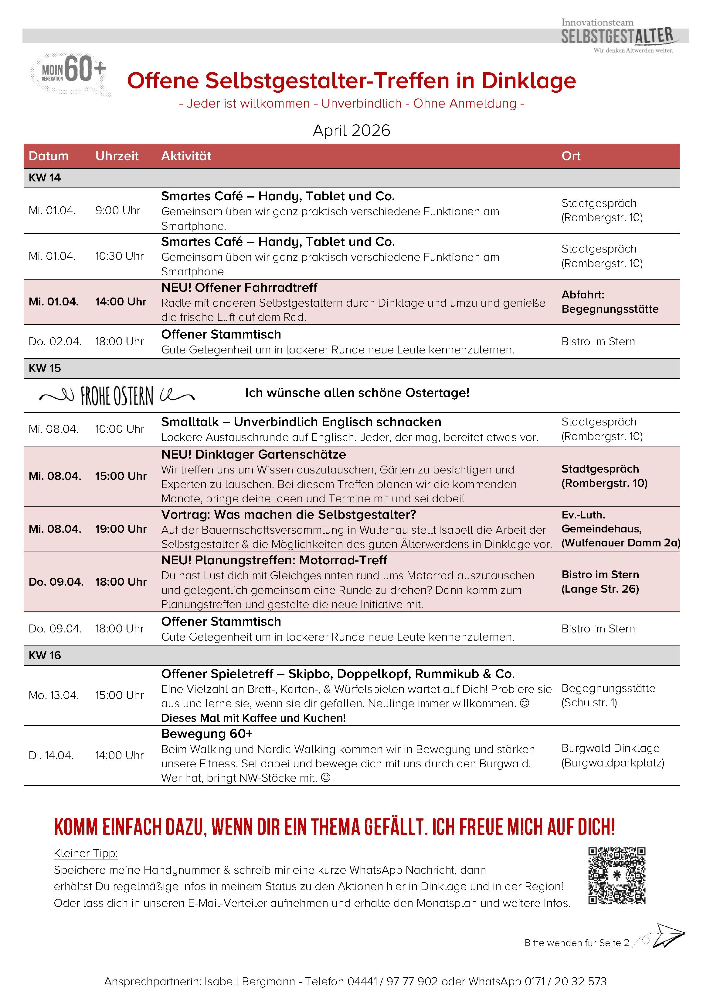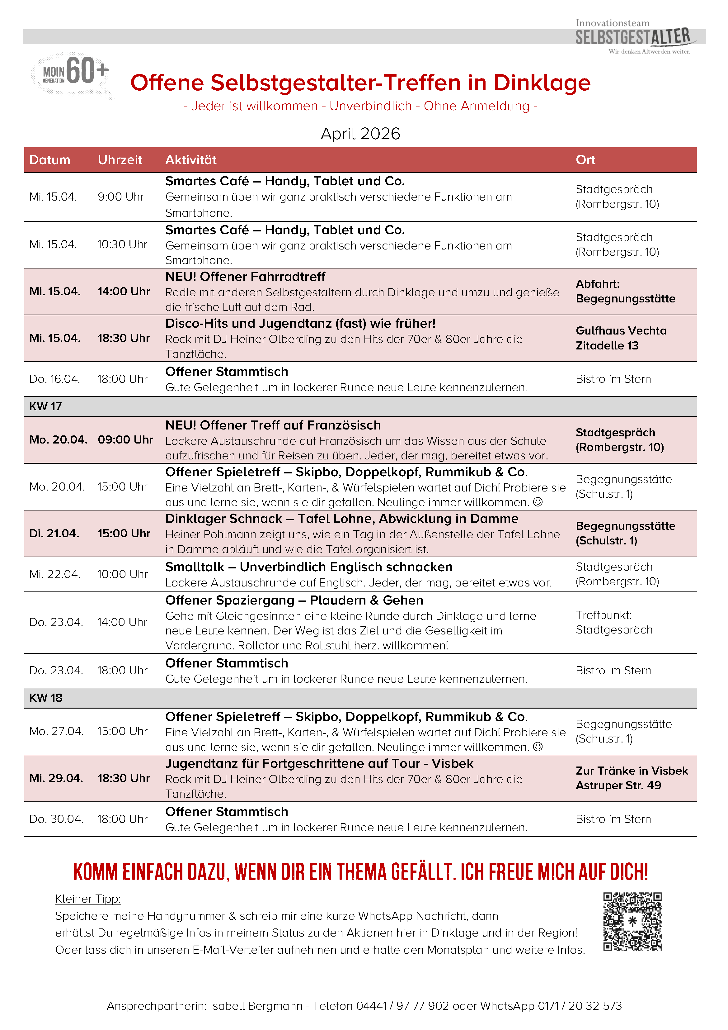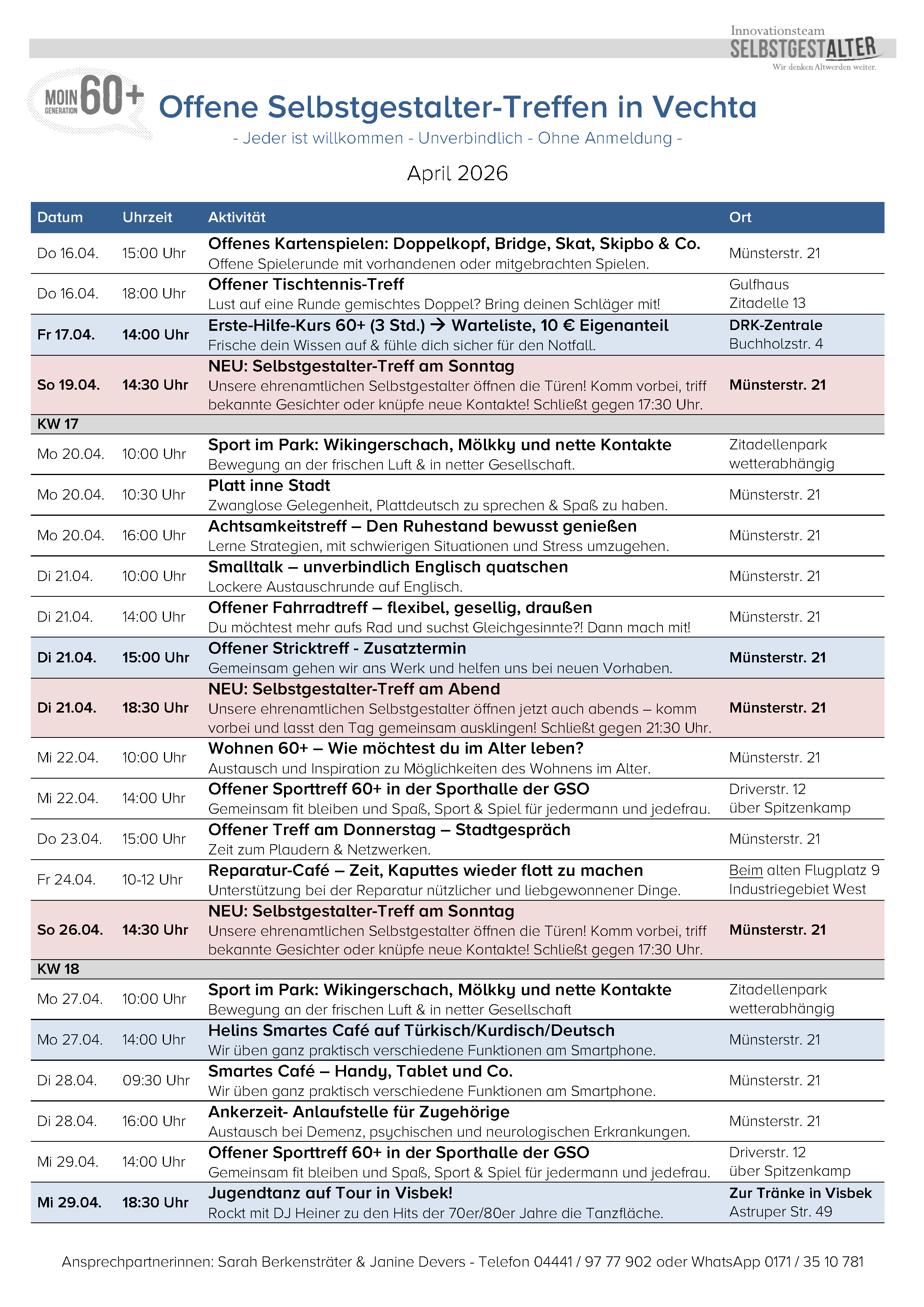 Du bist auf der Suche nach einer sinnvollen Aufgabe, um deinen Ruhestand zu beleben? Du möchtest Gleichgesinnte treffen? Hier ein paar Auszüge aus unserem tollen Programm: