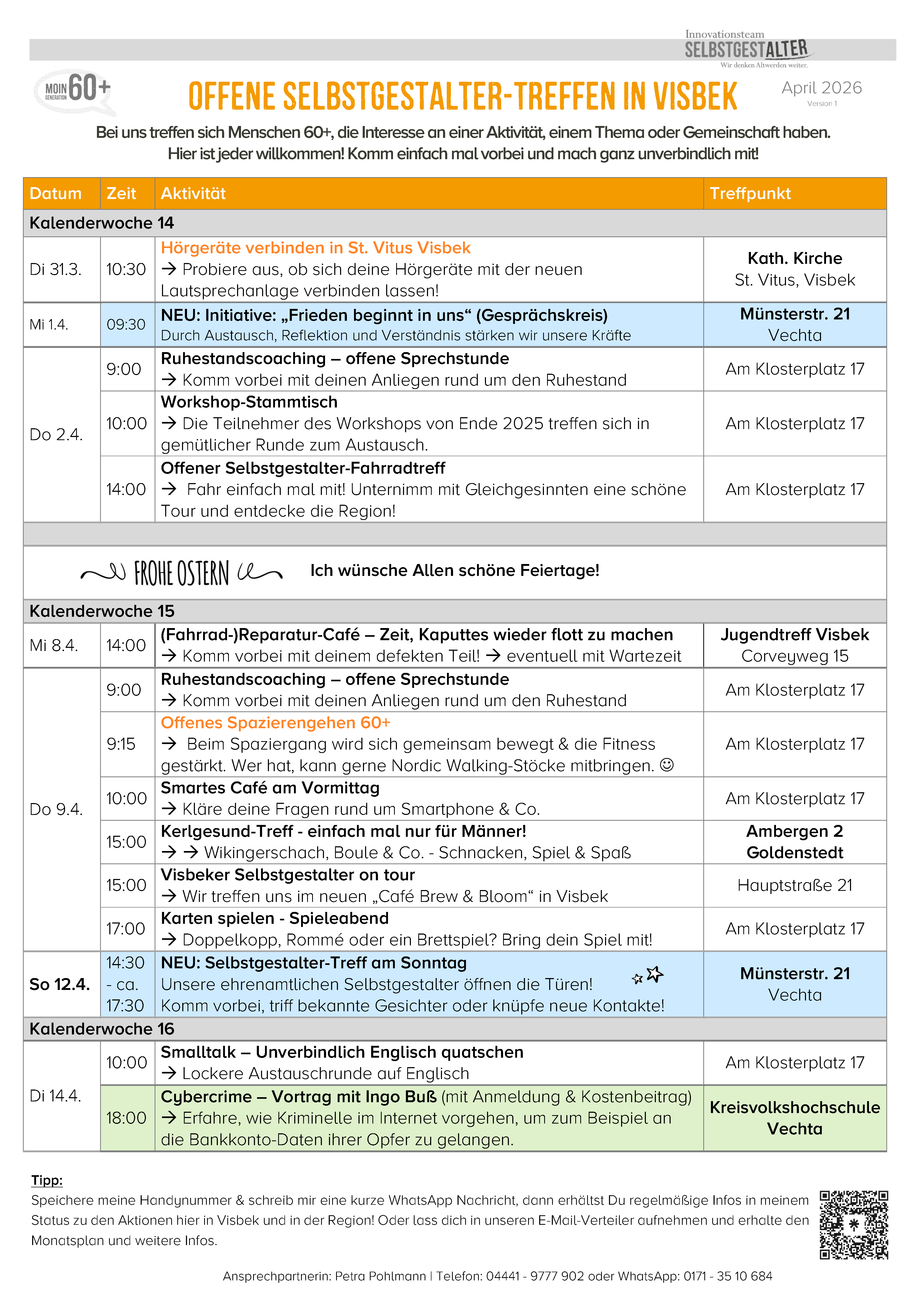 Vernetzt mit Kommunen, Bauerschaften, Ehrenamtlichen und Bürgern bringen wir kraftvoll innovativen Zündstoff in den Bereich der Altenhilfe. Wir planen Aktivitäten für und mit Menschen in der nachberuflichen Phase.