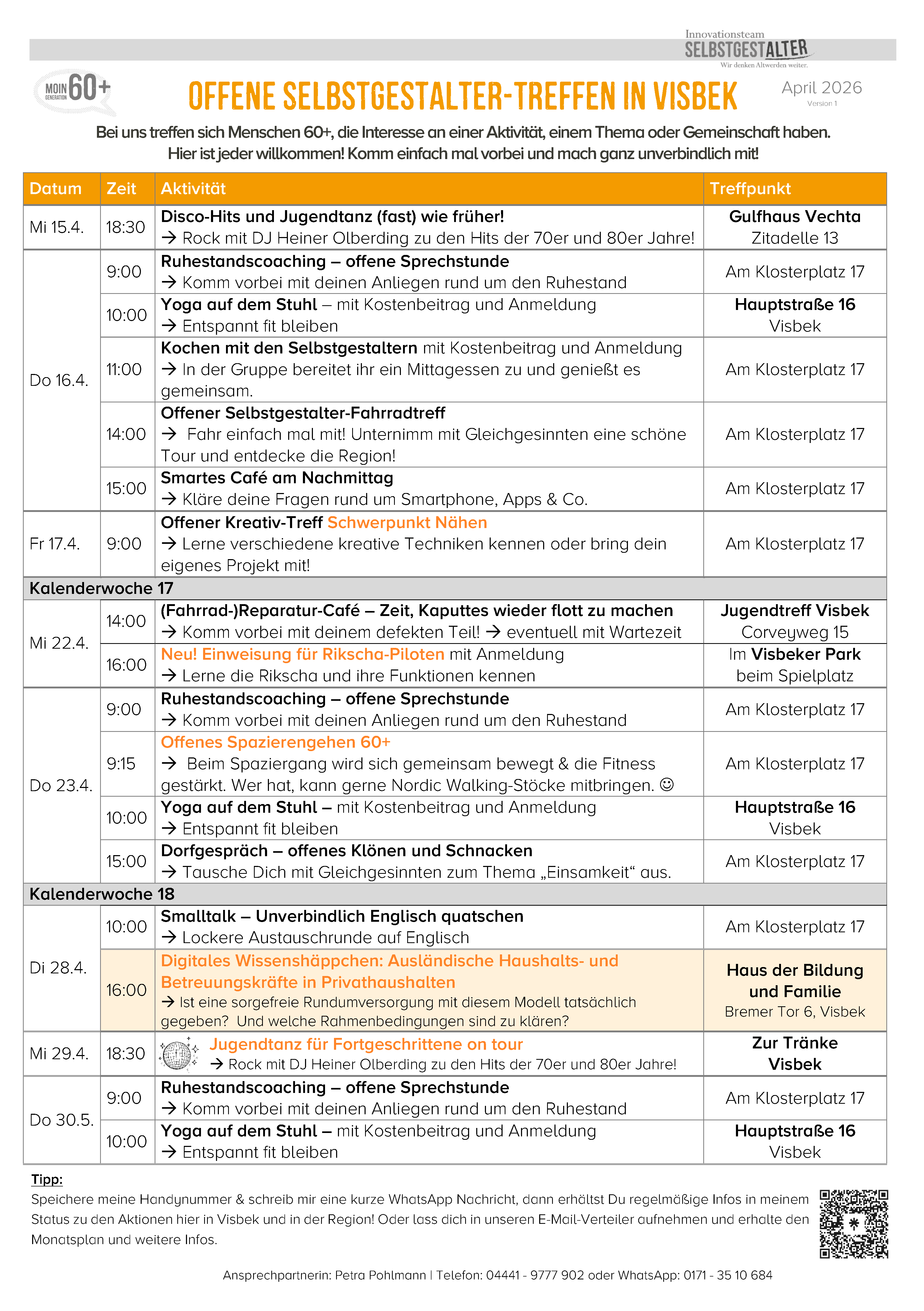 Gemeinsam werden bisherige Vorstellungen hinterfragt, neu gedacht und gegen spannendere Konzepte und Ideen ausgetauscht. Wir stellen die Weichen für ein gutes Altwerden! Für ein aktives Leben im Alter… heute schon... wann denn sonst?