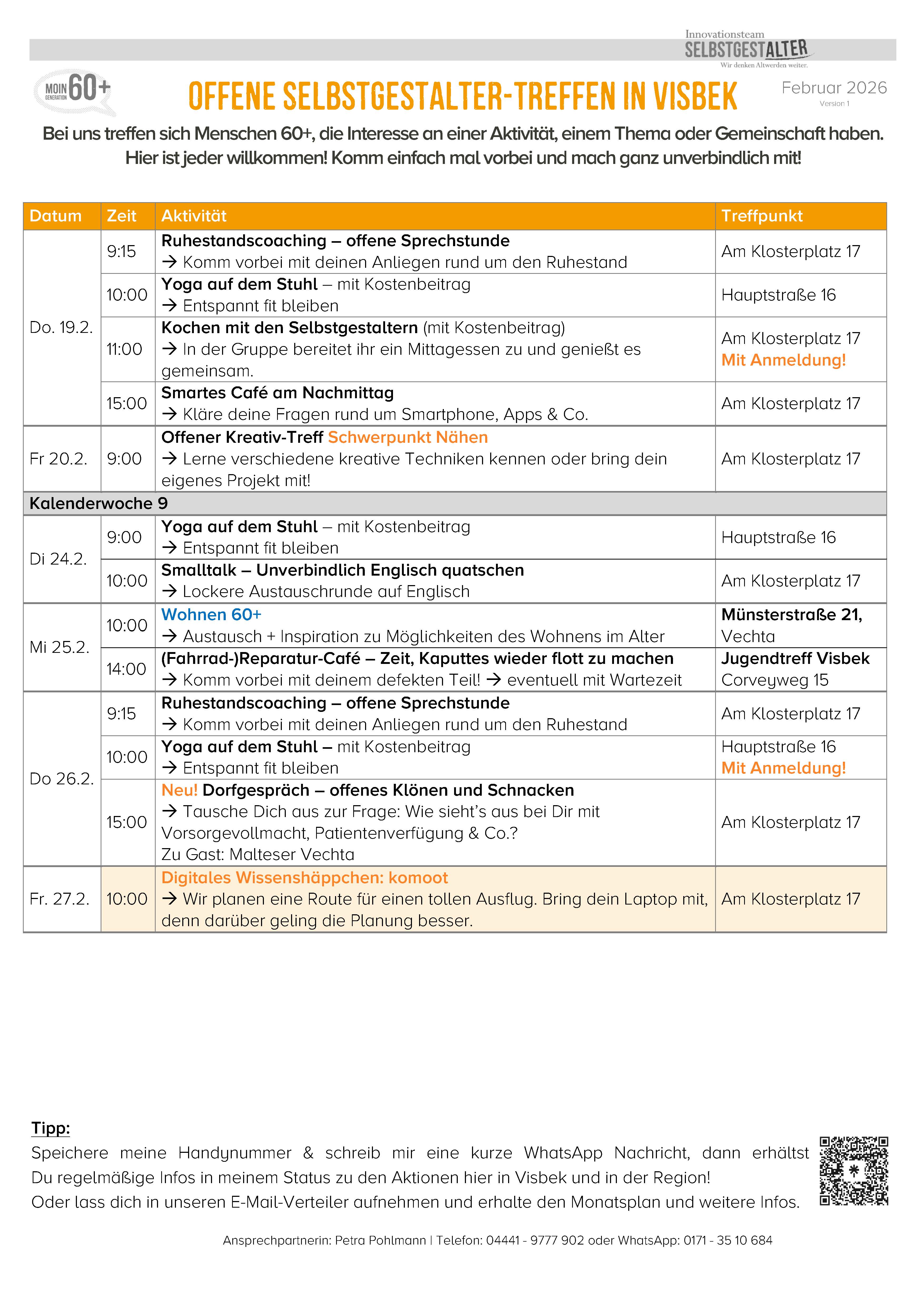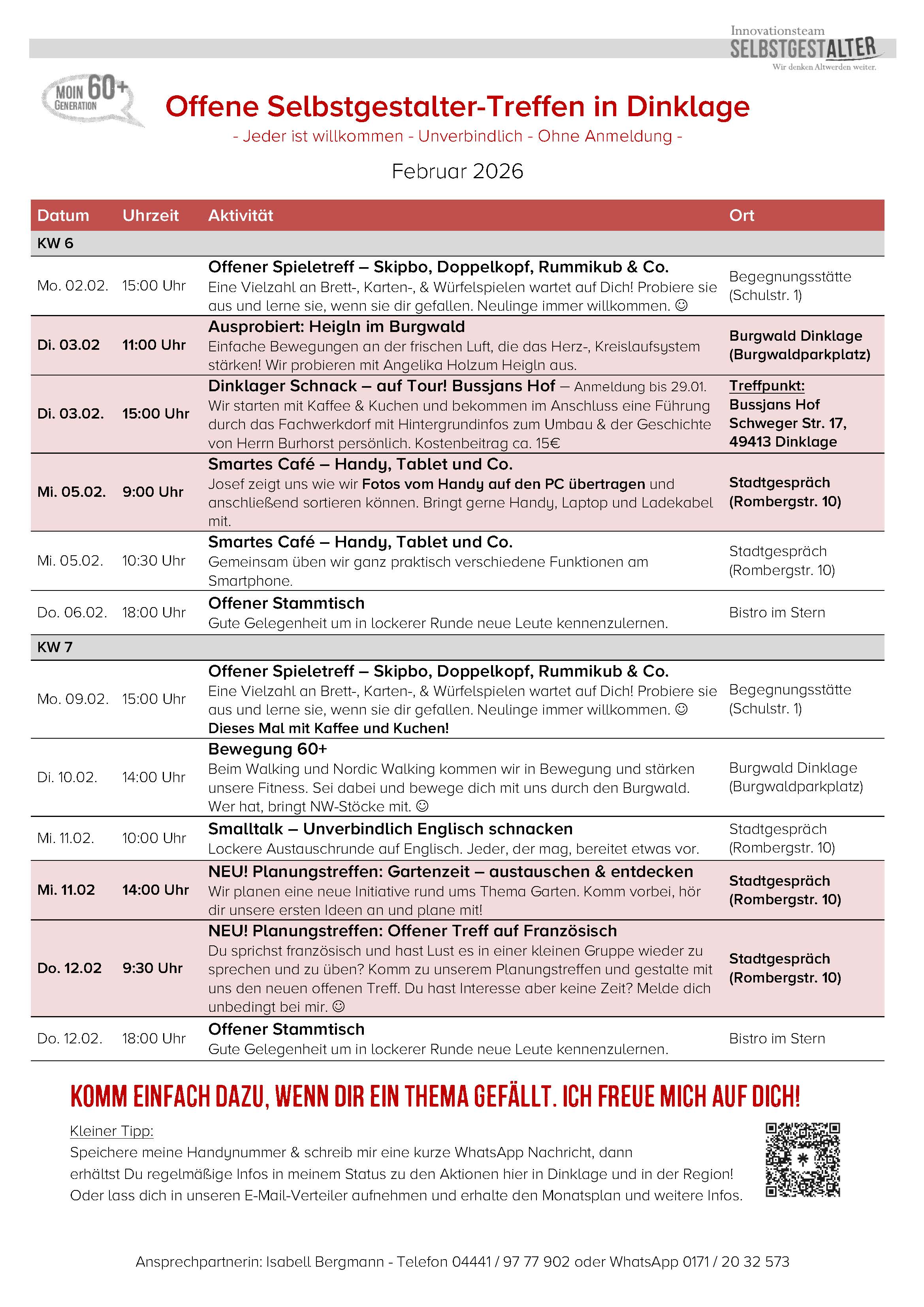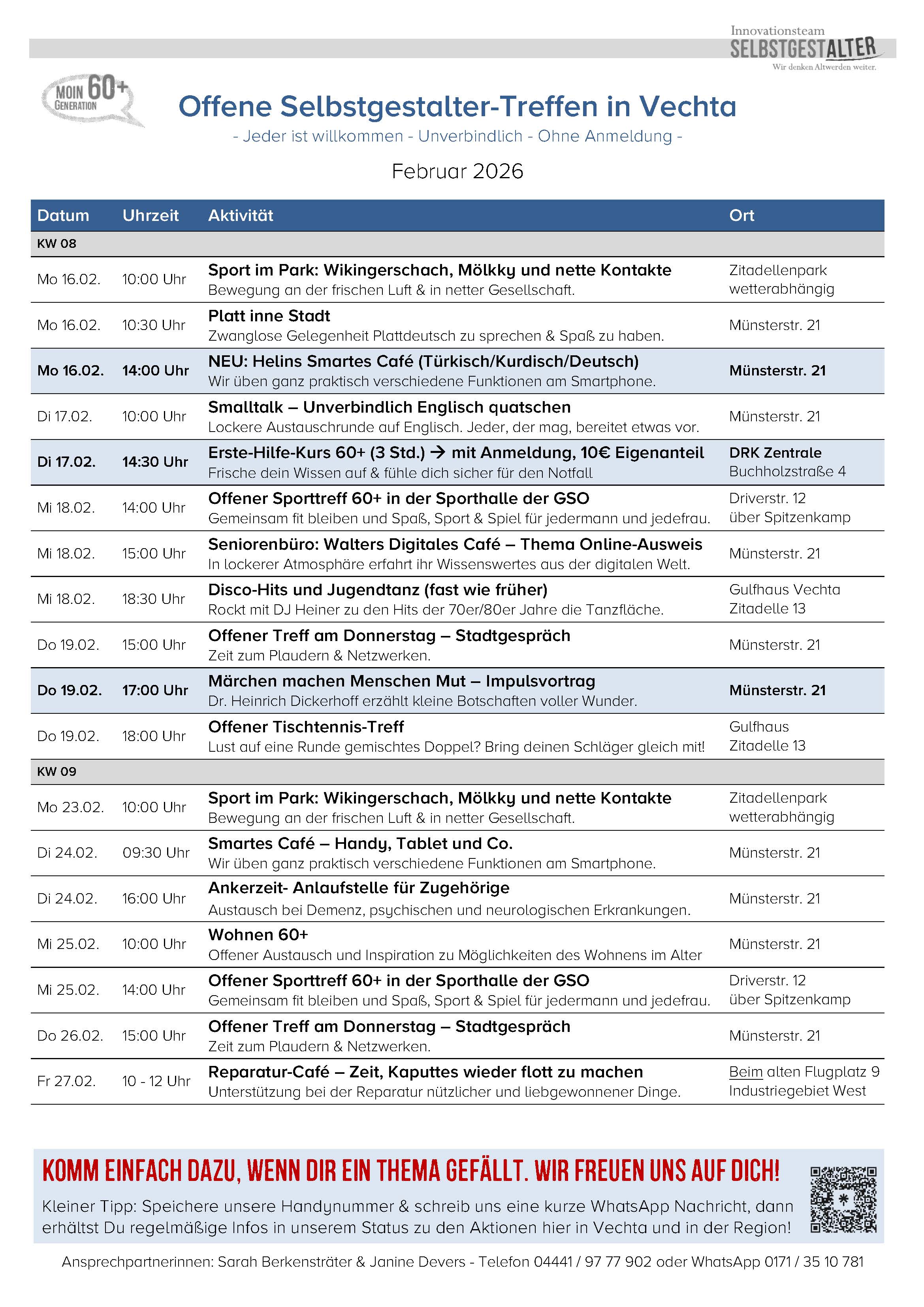 Du bist auf der Suche nach einer sinnvollen Aufgabe, um deinen Ruhestand zu beleben? Du möchtest Gleichgesinnte treffen? Hier ein paar Auszüge aus unserem tollen Programm: