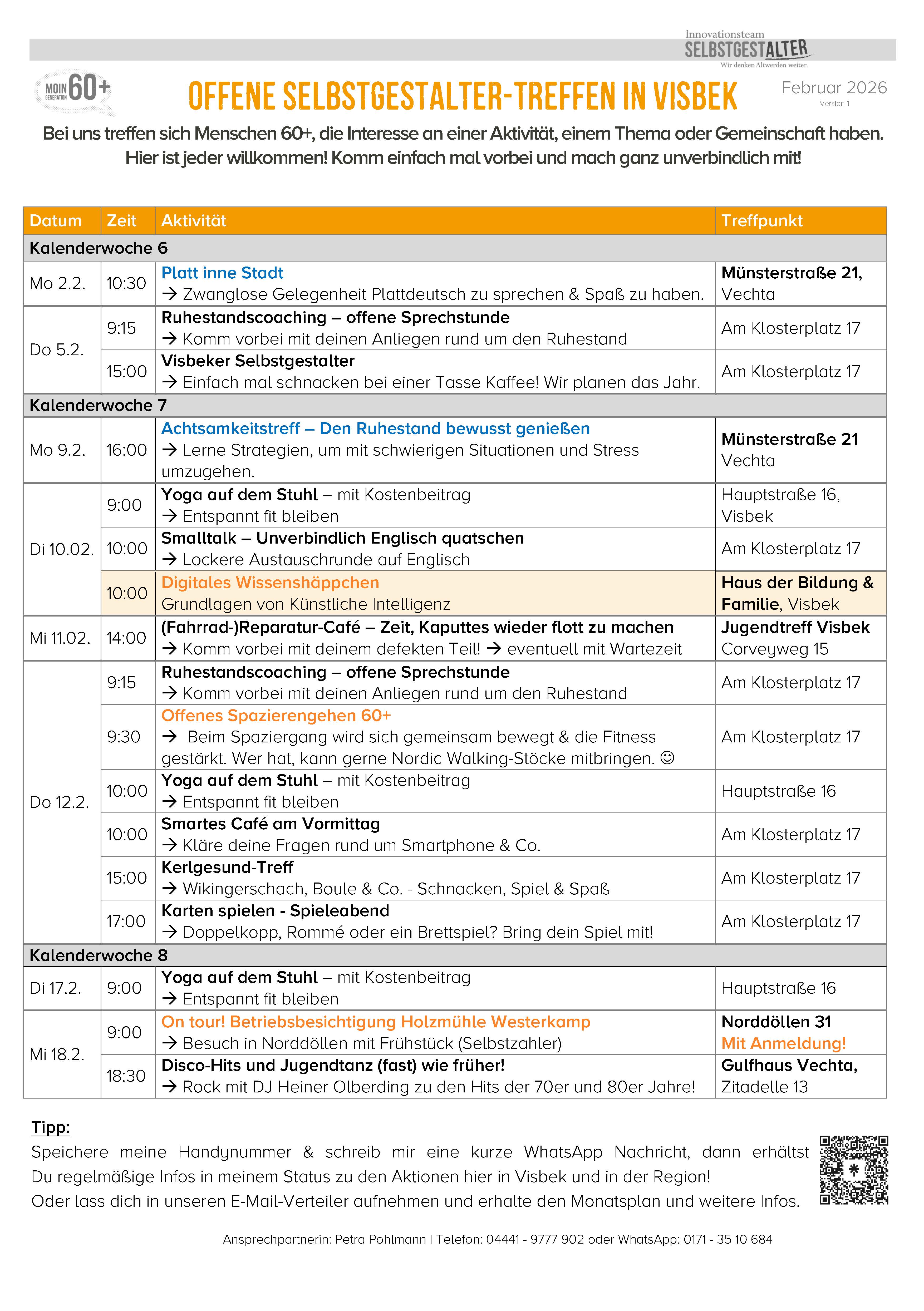 Vernetzt mit Kommunen, Bauerschaften, Ehrenamtlichen und Bürgern bringen wir kraftvoll innovativen Zündstoff in den Bereich der Altenhilfe. Wir planen Aktivitäten für und mit Menschen in der nachberuflichen Phase.